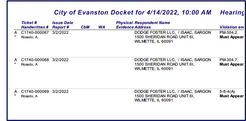 There were multiple common problems related to this data generally that needed to be corrected, including the manual alignment of the data into a standard format. Some docket pages on the City of Evanston website were in inaccessible files (file would not open), were posted more than once, or were filed in the wrong folder.